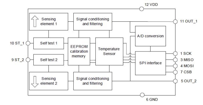 Inside the IC are two identical accelerometers arranged along the same axis and pointing in opposite directions. The outputs are meant to feed a differential amplifier or differential-input ADC. This differential measurement technique helps to reduce noise and removes common-mode measurement errors.