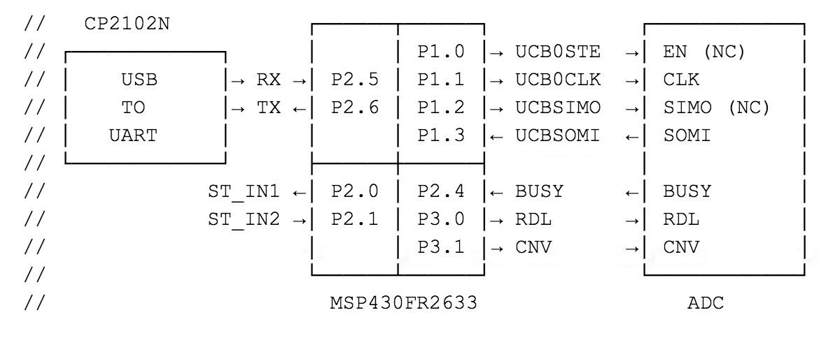 The ADC value is read by the TI MSP430 microcontroller. TI’s MSP430 microcontrollers have been my MCUs of choice for the last several projects. I could have chosen the MSP430FR2433 to have access to additional GPIO lines, but no other pins were required for this project. The MSP430FR2633 has capacitive touch pin capability that would allow an external calibration button to be implemented on a future control board.