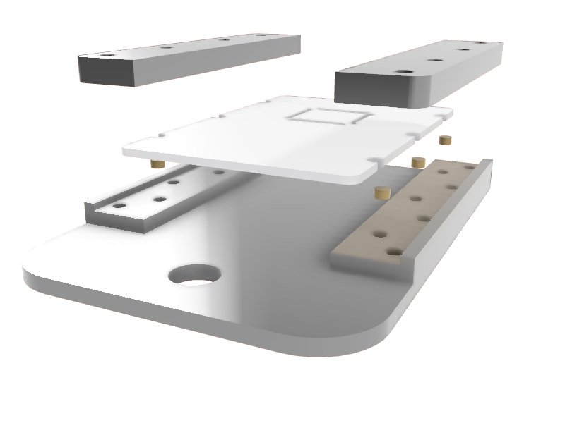 Shown above is an exploded render of the PCB holder, alignment pins, PCB, and PCB clamps