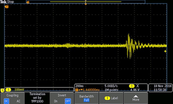 If this board were intended for mass manufacture, this is a problem I would certainly need to solve, especially since it's impossible for me to tell at this point whether the noise is benign or an indication of something more serious. However, this particular noise event did not appear to negatively affect the performance of the device.