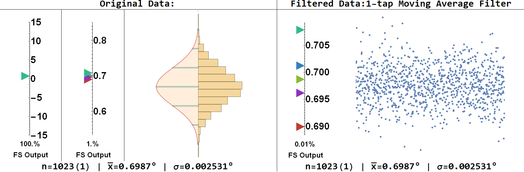 muRata’s datasheet states that the device is capable of discerning angular displacement with a resolution of 0.001°, which corresponds to ~14 bits. The low temperature dependency (correctable) and low noise density (not correctable), along with muRata’s policy of publishing their worst specifications over the entire operating range of the device, led me to believe that performance might be better than specified in certain circumstances.