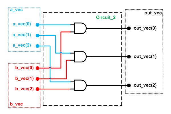As you can see, there is a certain relationship between the blue input ports and the red ones: the corresponding inputs are combined with the AND operator. The result is assigned to an output port. In such cases, we can group the signals and treat them as a vector. This makes the code compact and readable.