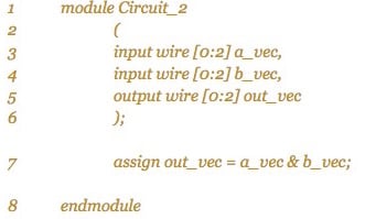 The above code also uses some new Verilog bitwise operators: ~ for NOT and | for OR operation. Another useful bitwise operator is ^ for the XOR operation. Figure 4 shows both the Verilog and VHDL descriptions for the Circuit_2 module. Such comparisons can help you see the differences and similarities between these two languages.