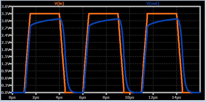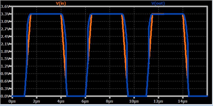 A 3.3 V control signal is applied to the gate, and the input signal transitions between ground and 3.3 V. The small amount of load capacitance represents the input capacitance of the downstream circuitry.