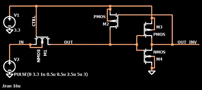 A basic inverter, then, is not an adequate method of PTL signal restoration. It’s almost an adequate method, though—all we need to do is add one strategically connected PMOS transistor.