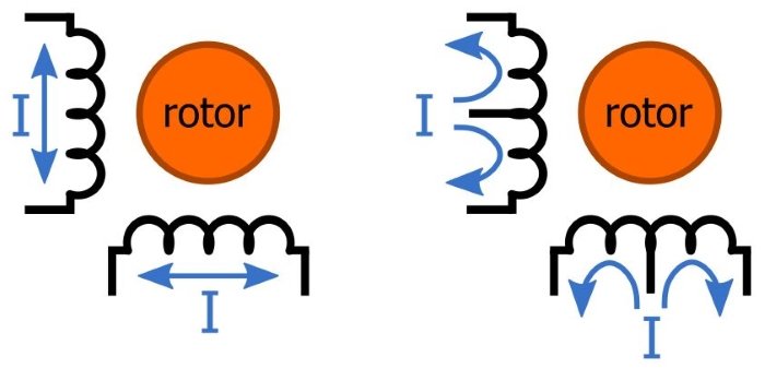 Bipolar drive (on the left) and unipolar drive (on the right). The direction of the current flow in the unipolar system indicates that the center of each winding is connected to the motor’s supply voltage.