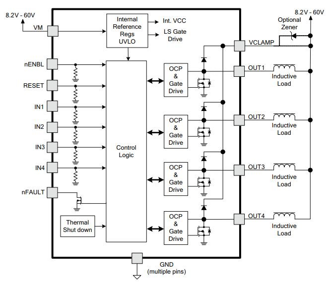 An example of a part in the “generic IC” category is the DRV8803 from Texas Instruments. This device is described as a “driver solution for any low side switch application.”