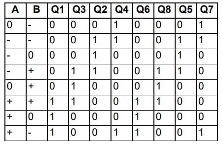 This is a full-step pattern for bipolar stepper-motor control. “A” and “B” refer to the two windings, and the “Q” columns indicate the state of the transistors that control the winding current. Table taken from this app note published by Silicon Labs.