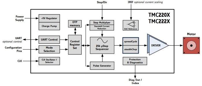 The step size can be as small as 1/32 of a full step, and then there is some sort of interpolation functionality that provides “full 256 microstep smoothness.” This chip also gives you an idea of how sophisticated a stepper driver can be—it has a UART interface for control and diagnostics, a specialized driver algorithm that improves standstill and low-speed operation, and various other things that you can read about in the part’s 81-page datasheet.