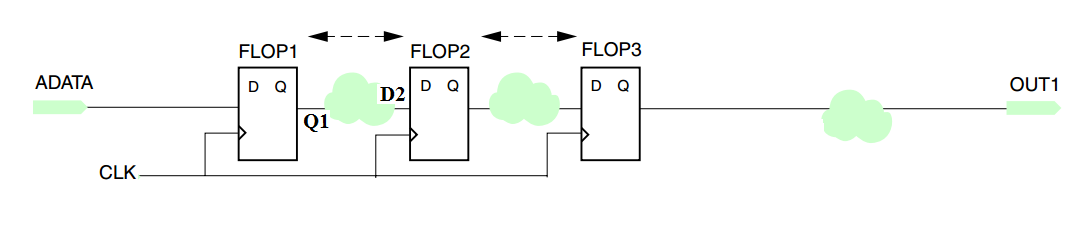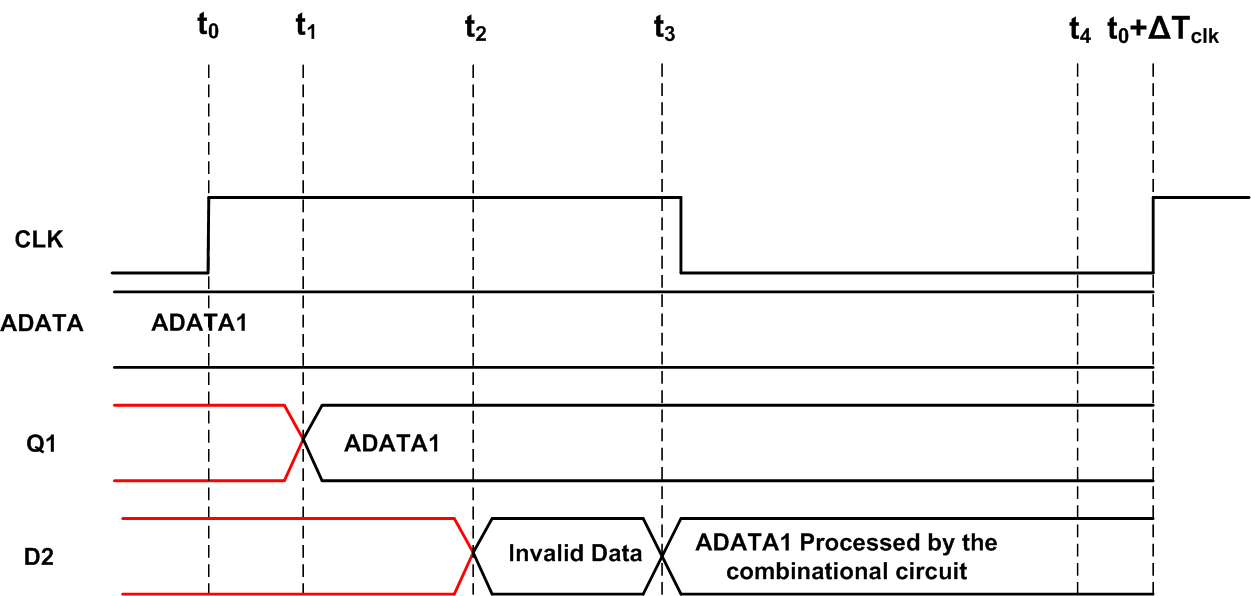 As shown in Figure 2, at the rising edge of the clock, a particular sample from the input data, ADATA1, is taken by the first flip-flop, FLOP1. A flip-flop cannot update its output immediately after the clock edge. Due to this delay, which is called the clock-to-Q delay, the output of FLOP1 will change at as shown in Figure 2. Hence, .