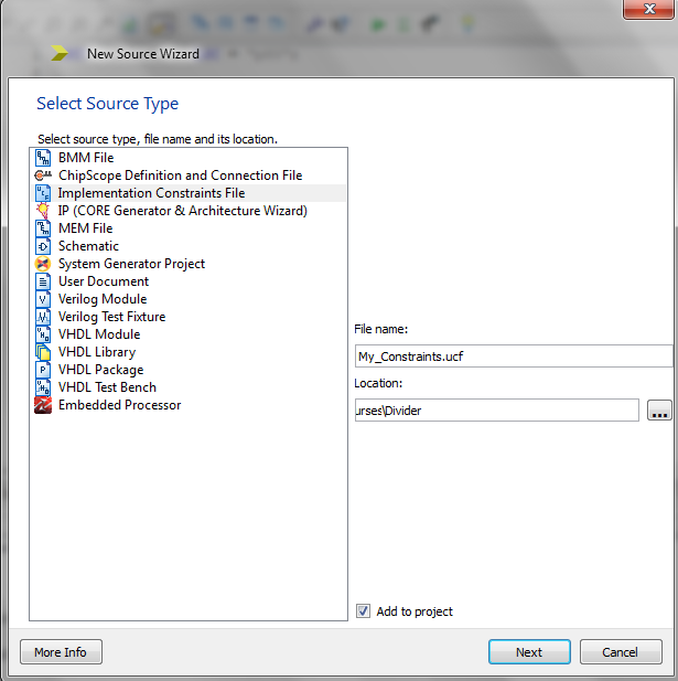 In a previous article, we discussed the VHDL code for a basic binary division algorithm. Now, we will use a PERIOD constraint to specify the clock frequency of our division algorithm. First, we need to add a User-defined Constraint File (.ucf) to our project. In the ISE software, click on “New Source” and choose “Implementation Constraints File” as the source file type. This is shown in Figure 3 below. Name this new source file “My_Constraints.ucf” and go on with the rest of the “New Source Wizard”.