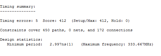 Now, there are timing errors and the maximum clock frequency is lower than our desired frequency. From the timing report we can find out the path that has unacceptable delays and, then, we can try to improve the timing of our design by applying different techniques. You can find some references to these techniques here.