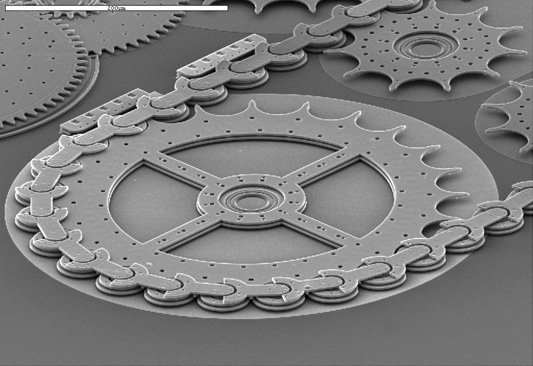 This is a physical gear and chain. This machinery moves and functions as you would expect a gear and chain to move and function. However, the links in the chain are about 50 µm long—i.e., less than the diameter of a human hair. Image courtesy of Sandia National Laboratories.