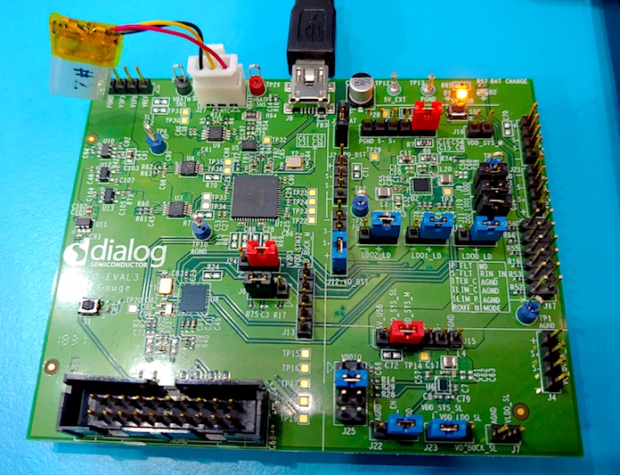 The DA9070 has a dev board for designers to work with. The board comes with a 80mA hour battery, a common size for, say, a fitness tracker. In addition to the PMIC there's also included a typical MCU (an m4 ARM Cortex core) loaded with Dialog Semiconductor firmware to measure voltage and current and to run the algorithm to create fuel gauge.