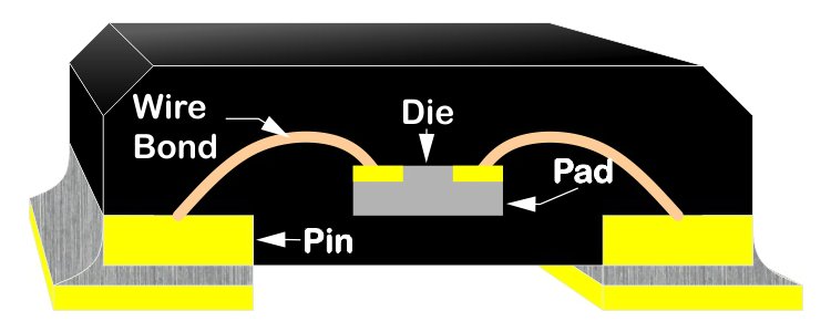 Inside every IC package is a die that is physically connected to the pins of the IC package, typically with bonding wires.