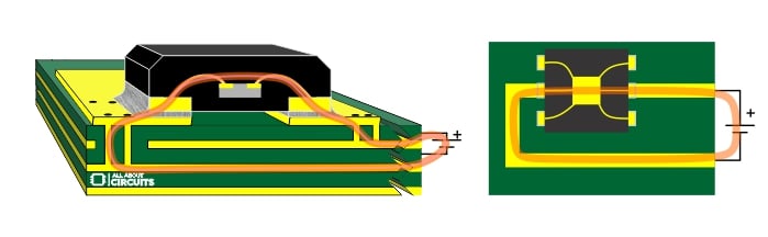 This 3D cross-section and top-view of a fictitious circuit shows the current path in the vertical and horizontal orientation through an arbitrary component. All changing signal lines will find a return path to the source.
