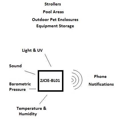 Used outdoors, as shown below, the 2JCIE-BL01 can stand sentry to strollers, pool areas, storage sheds, as well as outdoor pet enclosures. Constantly monitoring the environment, notifications of changing conditions can provide a timely alert to prevent unsafe situations.
