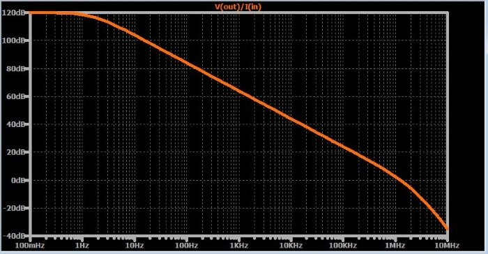 If you attempt to simulate the frequency response of a charge amplifier circuit, you may be confused by the results. For example, I generated the following Bode plot for a circuit with CF = 100 nF, RF = 1 MΩ, RIN = 100 Ω, and CP = 1 nF.
