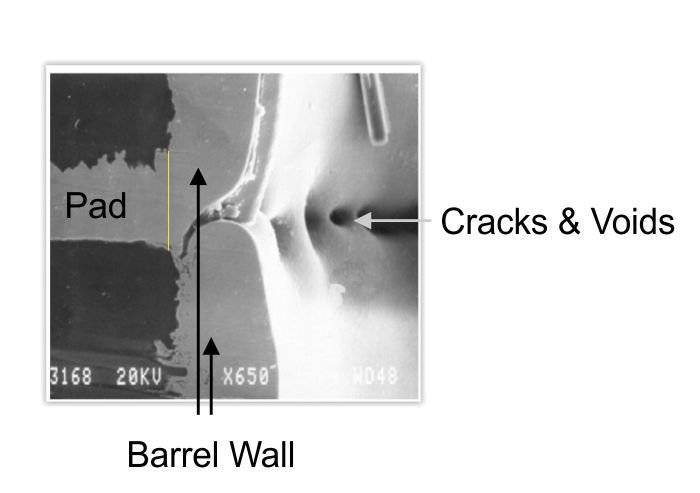 Image courtesy http://www.pwbcorp.com shows a via crack propagating during Z-axis expansion.