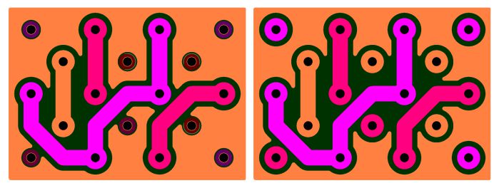 In this example, the removal of non-functioning pads (left) allows the copper pour to fill more of the board than in the version where the non-functioning pads are kept.