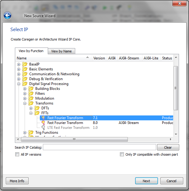 To add the FFT core to your ISE project, click on “New Source” under the “Project” tab and choose “IP (CORE Generator & Architecture Wizard)”. After giving your new source a name and location, you can find the FFT core by choosing “FFTs” from the “Digital Signal Processing” category, as shown in Figure 1.