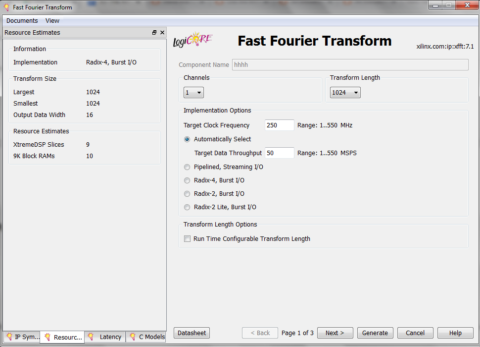 Next, we reach the “Implementation Options”. As shown in Figure 2, there are five different options for the core implementation. The first option is “Automatically Select”. In this case, the software chooses the smallest implementation that meets the specified “Target Data Throughput” for a given “Target Clock Frequency”.