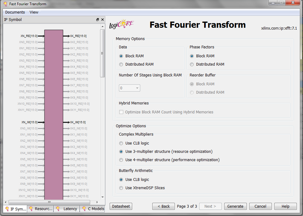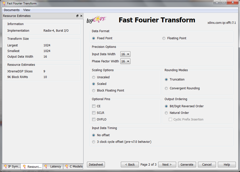 After specifying all these parameters, we can generate the core and add it to our design. Now that you have some insight into the different options of the Xilinx FFT core, you should be able to more easily grasp the material covered in the core datasheet. Remember that you’ll need to carefully investigate the core timing diagrams before you can use it correctly in your design!