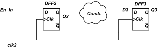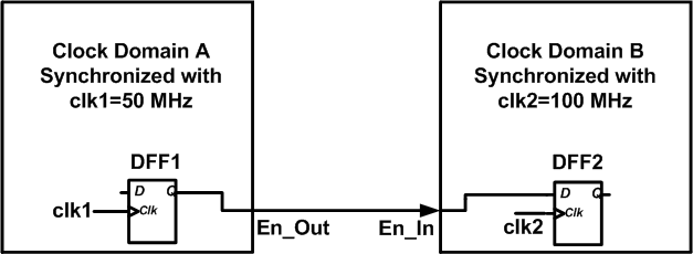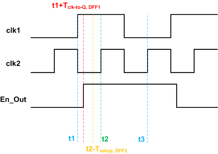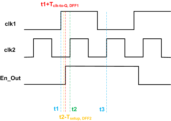 Assume that the clock waveforms are as shown in Figure 2 and the system is rising edge-triggered. Since the En_Out signal is generated by the A clock domain, its low-to-high transition can occur after a rising edge of clk1 as shown in the figure. The delay between the clk1 rising edge and the En_Out transition corresponds to the clock-to-Q delay () of the flip-flop in the A logic section. Now, we expect that the DFF2 register in the B domain will sample the enable signal at the next rising edge of clk2 at . The sampling will successfully happen provided the timing requirements of the DFF2 are met, i.e. .
