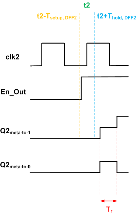 Since the input data of DFF2 has changed within the setup time, the register behavior will be unpredictable. Due to the setup time violation, the register output voltage could be the value representing a logic high, a logic low, or even worse a value between the logic high and logic low voltages. These three cases are possible while the input data was actually logic high at the corresponding clock edge. Similarly, the output value of the register will be unpredictable, when the register hold time is violated, i.e. En_Out changes within a time window after the active clock edge defined by the register hold time. When the output of the register becomes suspended at a voltage between the logic high and logic low voltages, we say that the flip-flop has entered a metastable state.
