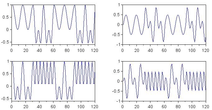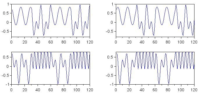 Symbol_Zero_I = cos(2*%pi*n / (SamplingFrequency/ZeroFrequency)); Symbol_One_I = cos(2*%pi*n / (SamplingFrequency/OneFrequency)); Symbol_Zero_Q = sin(2*%pi*n / (SamplingFrequency/ZeroFrequency)); Symbol_One_Q = sin(2*%pi*n / (SamplingFrequency/OneFrequency)); subplot(2,2,1) plot(n, Symbol_Zero_I) subplot(2,2,2) plot(n, Symbol_One_I) subplot(2,2,3) plot(n, Symbol_Zero_Q) subplot(2,2,4) plot(n, Symbol_One_Q) f = gcf(); for k=1:4 > f.children(k).font_size = 3; > f.children(k).children.children.thickness = 3; > end