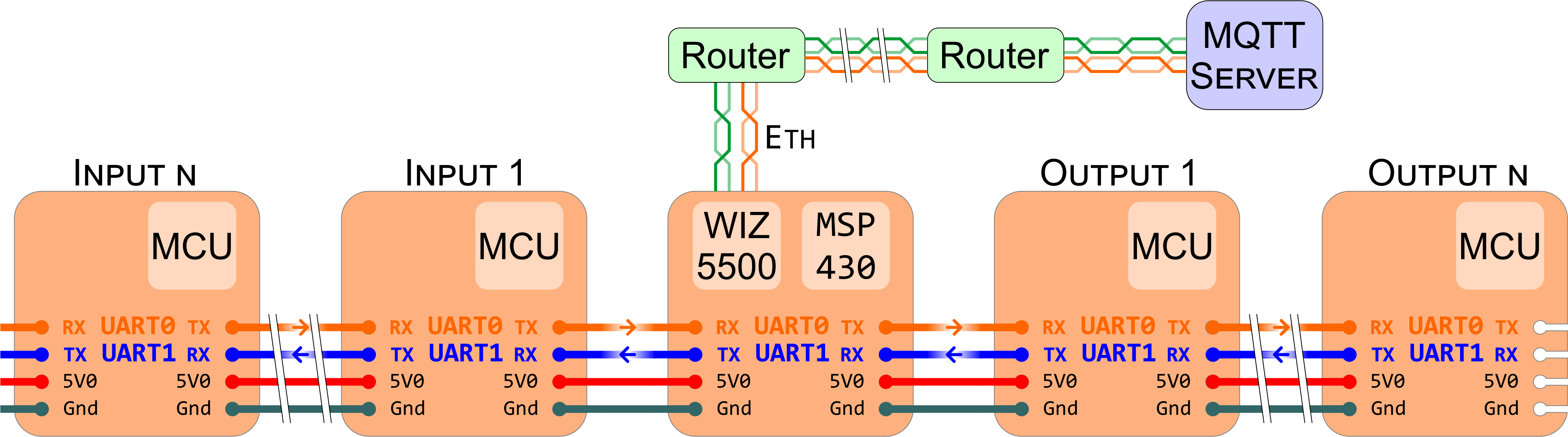This would work well enough for a three-wire interface (VDD, GND, Data) with one UART bus, but would require that all input nodes be placed before output nodes. By adding a second UART bus, bidirectional information can be passed and nodes can be added in any configuration. Alternatively, the second line might be used for microcontroller software updates, as a heartbeat monitor, or reserved for future use.