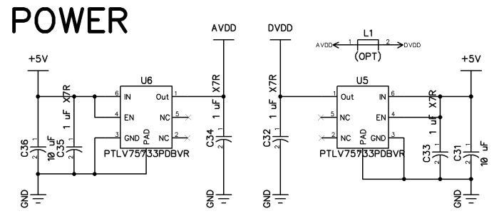 Each node in the system shares a common 5VDC rail. The 5V supply is generated by one board that serves as the power source for the entire network, and then each board uses two TLV757P LDOs to regulate the 5V rail to 3.3V for analog circuitry and 3.3V for digital circuitry. This is a four-layer board, with the top and bottom layers used for signals and layers 2 and 3 for AVDD and GND, respectively.