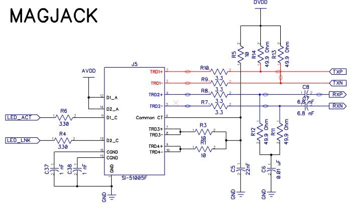 As you can see below, R7-R10 are damping resistors. I estimated their values based on other reference designs. They are necessary to prevent overshoot and ringing in the circuit. Testing would have to reveal if the lines are over/under/critically damped and the values adjusted accordingly. The transmit pair are pulled up to DVDD through 49.9Ω resistors, and the center tap is connected to DVDD through a 10Ω resistor and decoupled with a 22nF capacitor to ground. The receive pair passes through the damping resistors where it encounters two capacitors. The pair are tied through two 49.9Ω resistors to a 0.01 µF decoupling capacitor per manufacturer recommendation—they are further pulled up to DVDD through the center tap of the transformer winding.