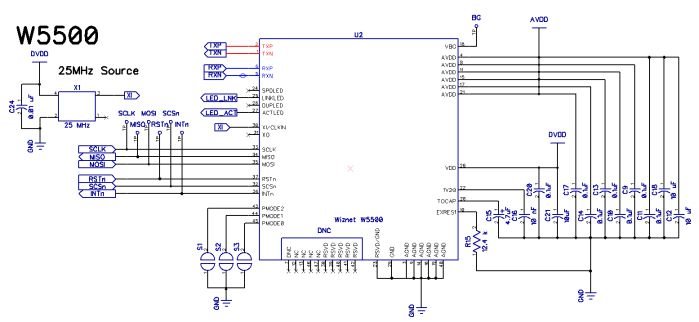 From a hardware perspective, the WizNet W5500 is a pretty straightforward addition to the circuit. An external crystal oscillator must be included and a half-dozen or so analog decoupling capacitors are needed—one for every AVDD pin. Pins 43-45 are used to select the network mode. I included pads for solder bridges should it be necessary to use something other than the default configuration (as it turned out I didn’t need to change the mode).