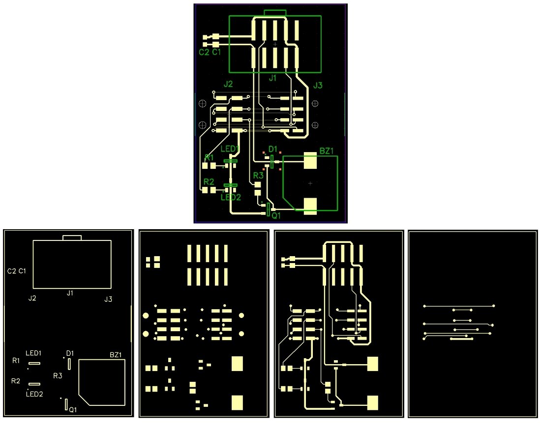 The layout is on the top, and the images in the bottom half represent the Gerber data for (left to right) the top silkscreen, the top solder mask, the top copper, and the bottom copper. I included the board outline in each file (just for visual purposes). This board is a C2 adapter that I designed for programming and debugging Silicon Labs microcontrollers. Click to enlarge.