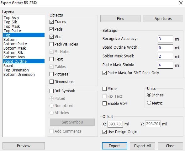 Generating Gerber files can be somewhat complicated. The process involves various configuration details, and different manufacturers have different requirements. The following screen capture shows the options that you have to consider when generating Gerber files with DipTrace.
