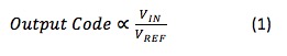 The ADC’s output code is proportional to the ADC input signal amplitude (VIN) divided by the ADC’s reference voltage (VREF), as expressed by Equation 1: