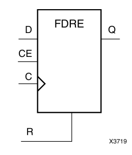 This particular DFF, which has a synchronous reset (R) and a clock enable (CE) input, is called an FDRE (Flip-flop, type D, synchronous reset, with clock enable) in the Xilinx Library Guide. The logic table of this element is shown in Figure 2.