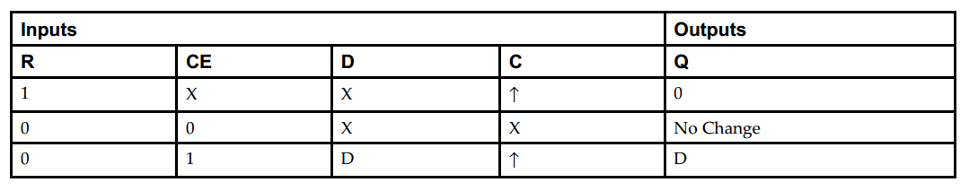Figure 2. The logic table of FDRE D-type flip flop of the Xilinx 7 series FPGAs. Image courtesy of Xilinx.