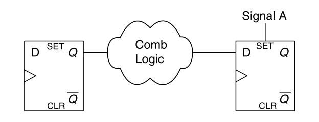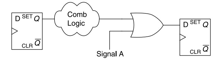 In Figure 3, when “Signal A” is logic high, the DFF output will go high at the clock edge no matter what the output of the combinational circuit “Comb Logic” is. That’s why, as shown in Figure 4, the synthesis software can eliminate the OR gate and apply “Signal A” to the synchronous set input of the DFF. Now, when “Signal A” is logic high, the DFF will be set to high at the clock edge. Otherwise, the output will be determined by the combinational circuit “Comb Logic”. The new design gives the desired functionality but, now, the OR gate is eliminated and both speed and area of the design can be improved.