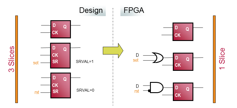 The three DFFs on the left cannot be placed in the same slice because they have different control signals. However, with the conversions discussed above, we obtain three DFFs with the same set of control signals. Hence, we can put the three DFFs in the same slice. Note that the above conversions are not valid with asynchronous set/reset signals. That’s why we are usually recommended to use synchronous set/reset signals rather than asynchronous ones.