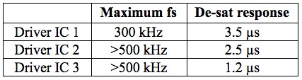 Table 1 compares the performance of different driver ICs with a 33 pF blanking capacitor. The results indicate that each of the ICs can protect SiC MOSFETs during shoot-through within 1–4 µs. Each of them also has “soft turn-off” features, which turn off the device slowly under short circuit conditions to protect both the MOSFET and the driving ICs.