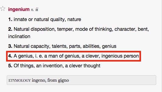 The etymology of "ingenium" according to Ultralingua. Well, if you insist.