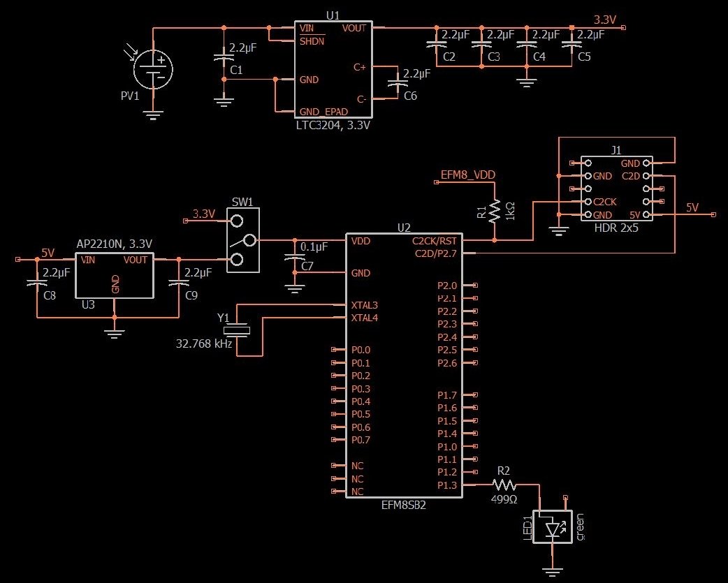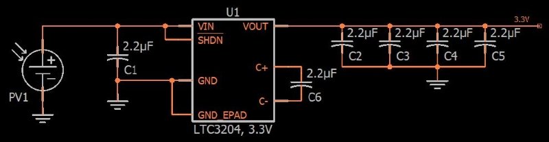 I recently designed a circuit board that gives me an opportunity to explore the use of solar power for embedded devices. My idea was the following: I wanted a reference design that would serve as a very compact, very straightforward way of using ambient light to generate 3.3 V for a microcontroller-based embedded system. I’ve tested the board enough to confirm that it does work, though it also has major limitations. In this article I’ll focus on the schematic design for the board.