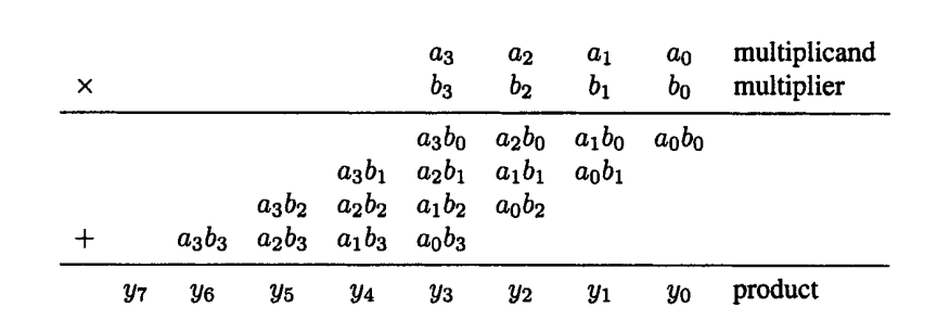 There are numerous structures, with different complexities and delays, that can be used to implement a binary multiplier. For example, when multiplying the two four-bit numbers shown in Figure 1, we can use logic gates to generate the partial products and then add them together to find the product.