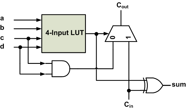 To implement the carry equation, note that when , we have . You can verify this from the above truth table. Also, when , . In Figure 2, when the output of the LUT is high ( ), the multiplexer will pass the input carry, , to . When , the output of the AND gate must be equal to either or .