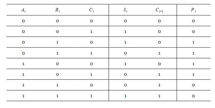 Here, and are the digits of the ith column of addition and is the carry produced by the previous column. Adding these three bits gives a sum, , and a carry . will be added to the digits of the next bit position. Based on the truth table, we obtain the following expressions: