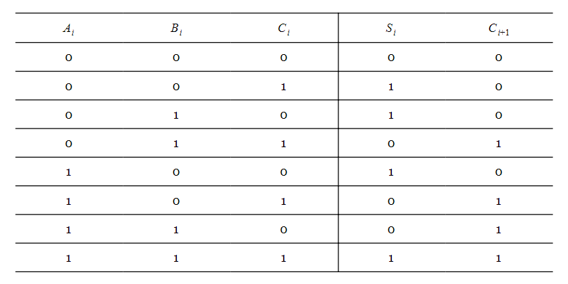 Here, and are the digits of the ith column and is the carry produced by the previous column. Adding these three bits gives a sum, , and a carry . will be added to the digits of the next bit position. Hence, for a four-bit adder that adds to , we have the following diagram: