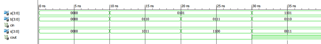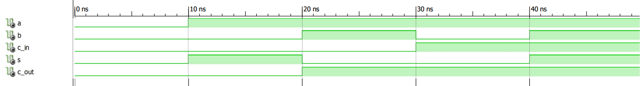 11 end Behavioral;a and b are the digits of the ith column and c_in is the input carry of the full adder. Adding these three bits gives a sum, s, and a carry, c_out. An ISE simulation for this code is shown in Figure 2.