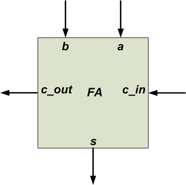 end component;This tells the synthesis software that FA is a component with three inputs (a, b, c_in) and two outputs (s, c_out). It also specifies the data type for these inputs and outputs.